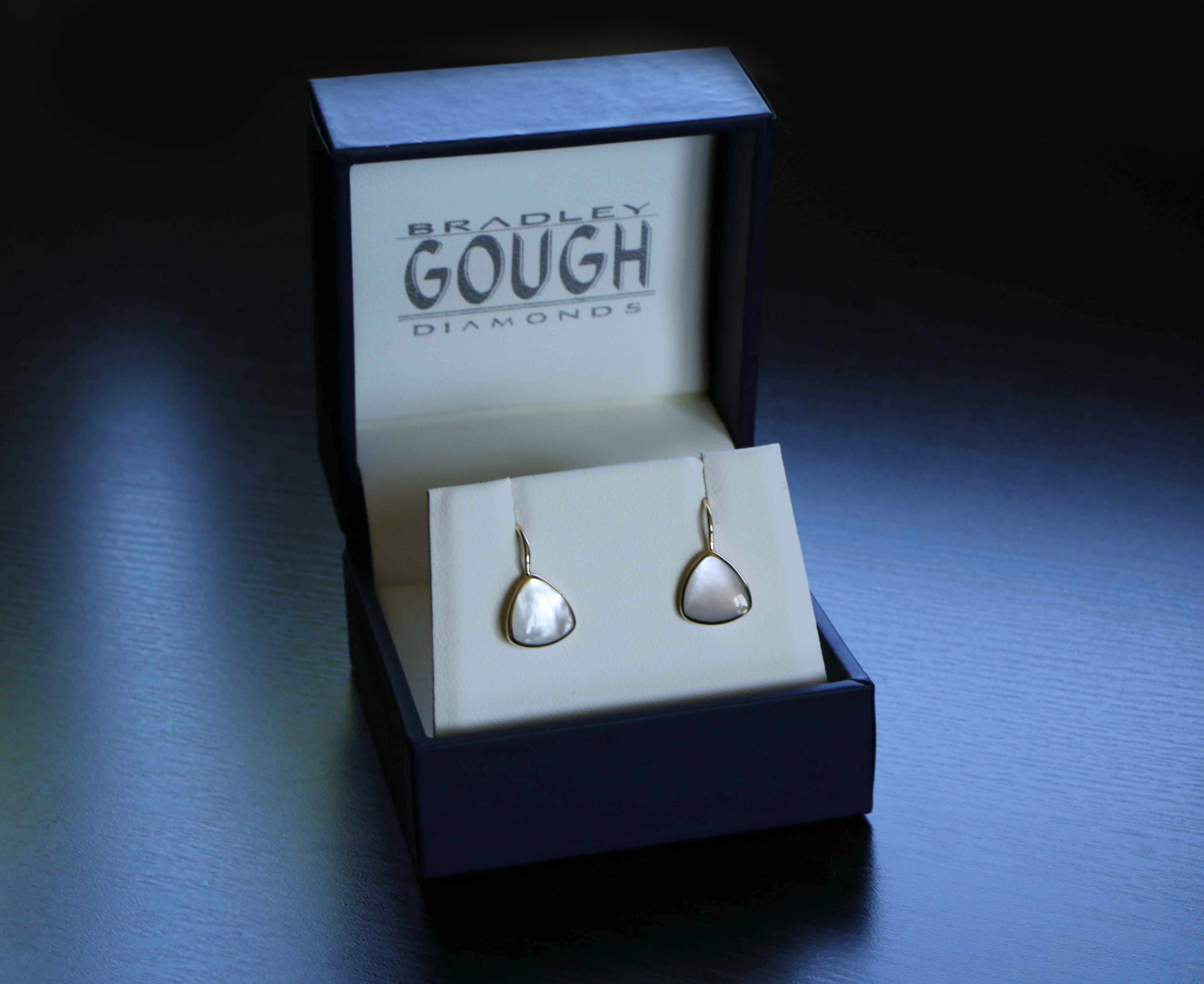 Enjoy this elegant pair of 14 karat yellow gold Kabana white mother of pearl drop earrings chosen specifically for this Wine&Stein event by our good friends at Bradley Gough Diamonds.
